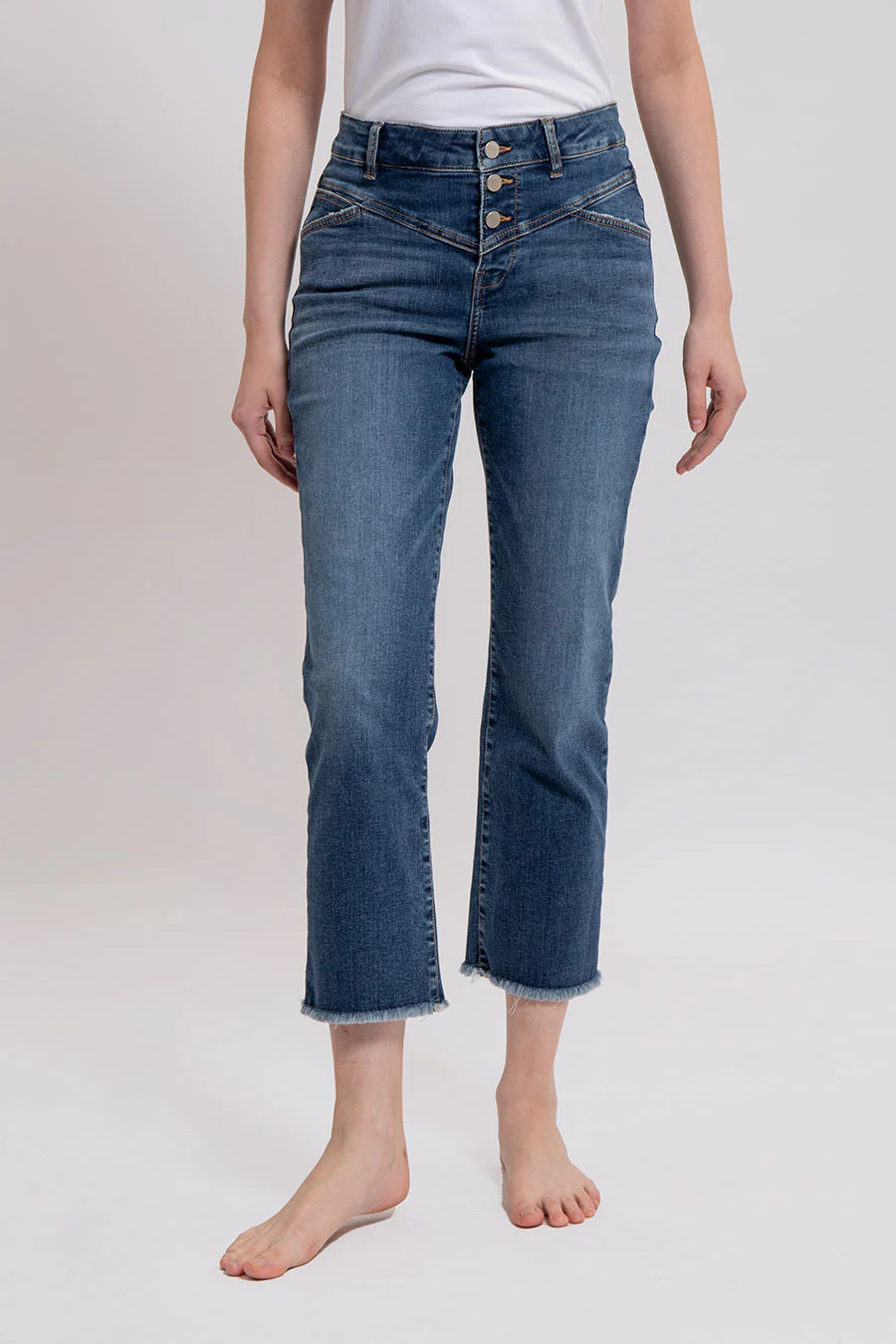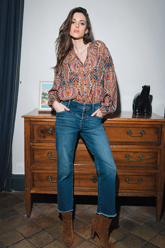 La forme bootcut cropped («courte») et la braguette boutonnée pour un mix de styles rock et bohème chic. Il convient à toutes les morphologies, aussi bien aux petites qu’aux grandes qui dévoileront leurs chevilles !